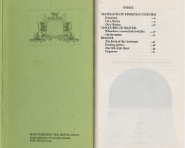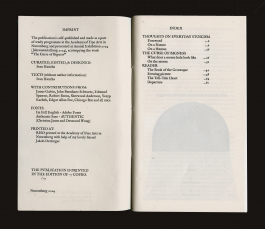 This publication is a small curated anthology of visual and textual stories, phenomena and bittersweet reflections on them, mapping various inspirations for my research. References to philosophy, history and literature serve as a material to consider adversity and courage - significant parts of modern Being, of our diverse society in today's complex world, where only a few can look with confidence to the future. The ability to face life's trials despite one's own vulnerability to fate was the main inspiration for this project.